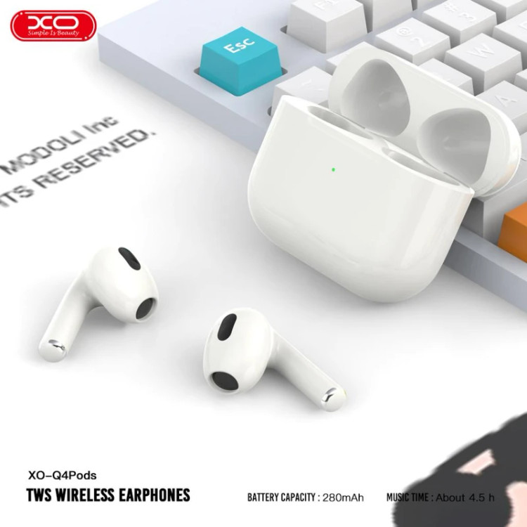 هدفون XO-Q4Pods تجربهای مدرن از موسیقی و مکالمه را با ترکیبی از طراحی ظریف، فناوری روز و راحتی در استفاده به ارمغان میآورد. وزن کل محصول تنها 42 گرم است و هر ایرباد با وزن 6.8 گرم، آنقدر سبک است که پس از چند دقیقه فراموش میکنید در گوش دارید. نسخه بلوتوث 5.3 همراه با تراشه AD6973D4، اتصالی پایدار و سریع با کمترین تأخیر فراهم میکند و از پروتکلهای متداول صوتی مانند HFP، HSP، A2DP و AVRCP پشتیبانی میکند. باتری داخلی هر ایرباد با ظرفیت 35 میلیآمپرساعت، تا حدود 4.5 ساعت پخش مداوم موسیقی (در حجم صدای 80٪) را فراهم میکند. کیس شارژ با باتری 280 میلیآمپرساعتی، با یک بار شارژ کامل در حدود 1.5 ساعت، آماده تأمین شارژ چندباره ایربادها خواهد بود. زمان آمادهبهکار طولانی بین 3 تا 6 ماه به شما این اطمینان را میدهد که حتی در استفادههای منقطع نیز همیشه آماده کار هستند. بدنه ساختهشده از ABS علاوه بر دوام، جلوهای شیک و خوشدست به محصول بخشیده است.